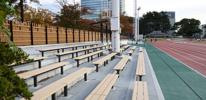 豊かな自然に囲まている代々木公園陸上競技場。近年の改修で設置されたベンチはよくある色鮮やかなプラスチック製ではなく合成木材製。木質感を持ち落ち着いた雰囲気で熱くなりにくいNAウッドのベンチが採用されました。奥行があって物 […]