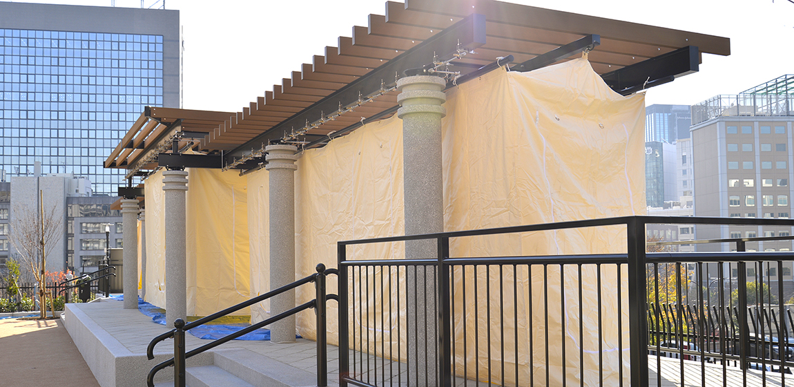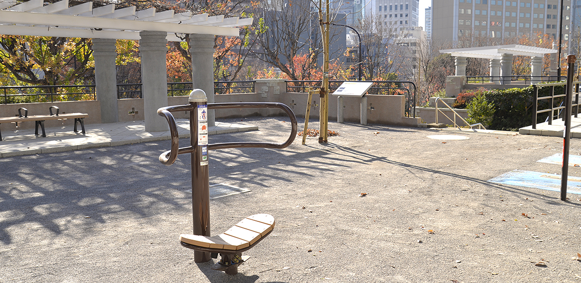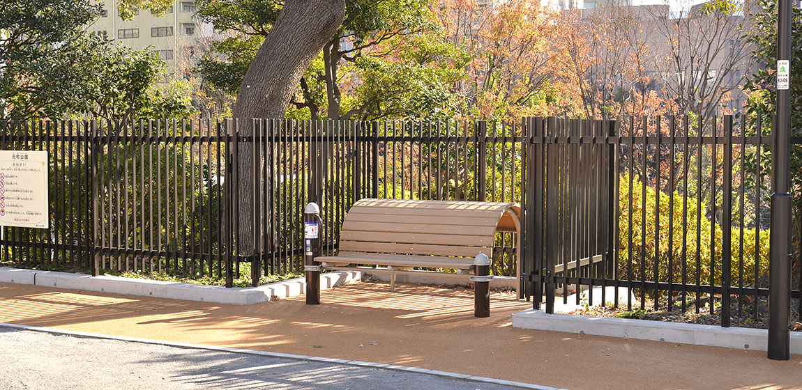 元町公園は関東大震災の復興公園として1930年(昭和5年)に開園。1982年(昭和57年)に開設当初の意匠の図面を参考に改修。当初の姿を残す公園として日本の歴史公園100選にも選定されています。今回設置したパーゴラは吊り下げ式テントが設営できる防災仕様。柱は当時のデザインと同じものをオリジナルで製作しました。健康をテーマとする複合施設、元町ウェルネスパークが隣接。健康器具やテーブル、ベンチが設置された公園は地元の方はもちろん、たくさんの人の憩いの場として親しまれています。