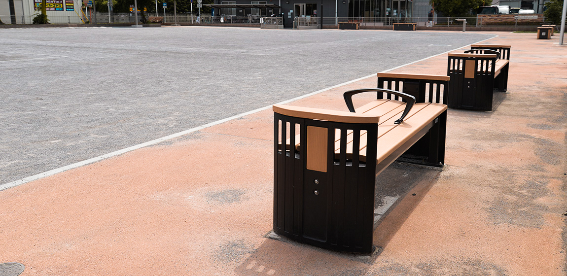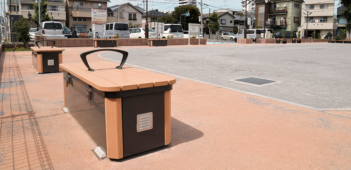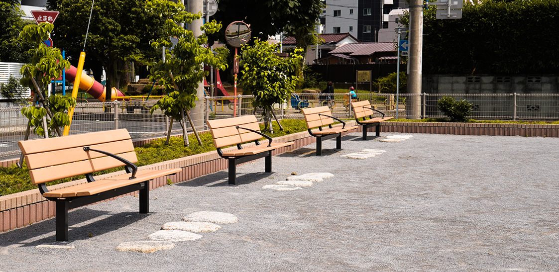 災害時の地域拠点としての役割も期待されています。ナカムラは、ベンチ、収納ベンチ、サークルベンチや