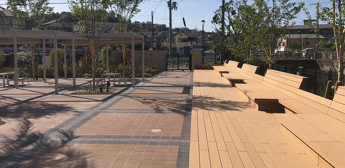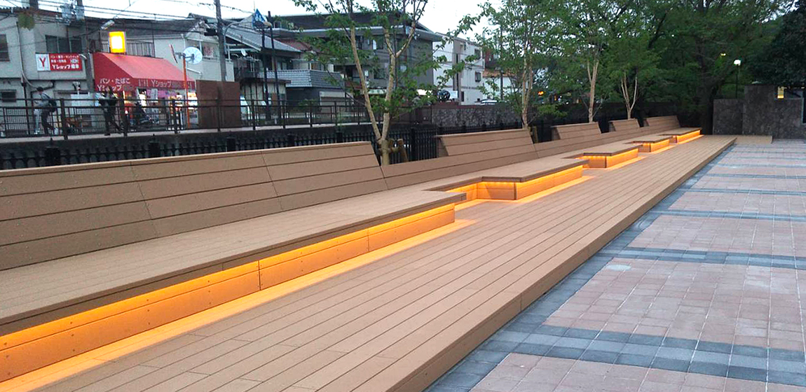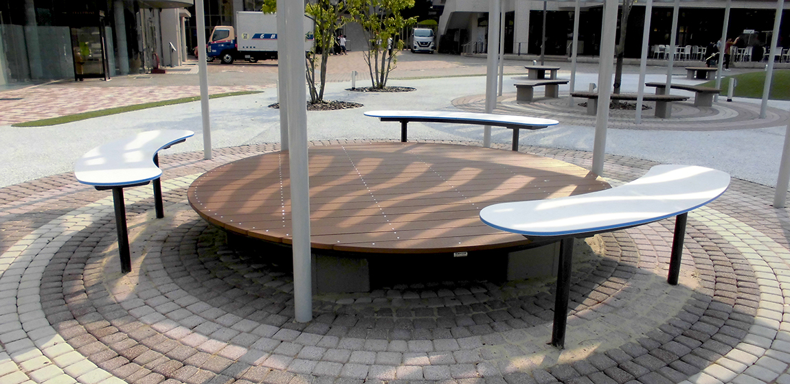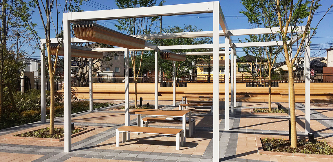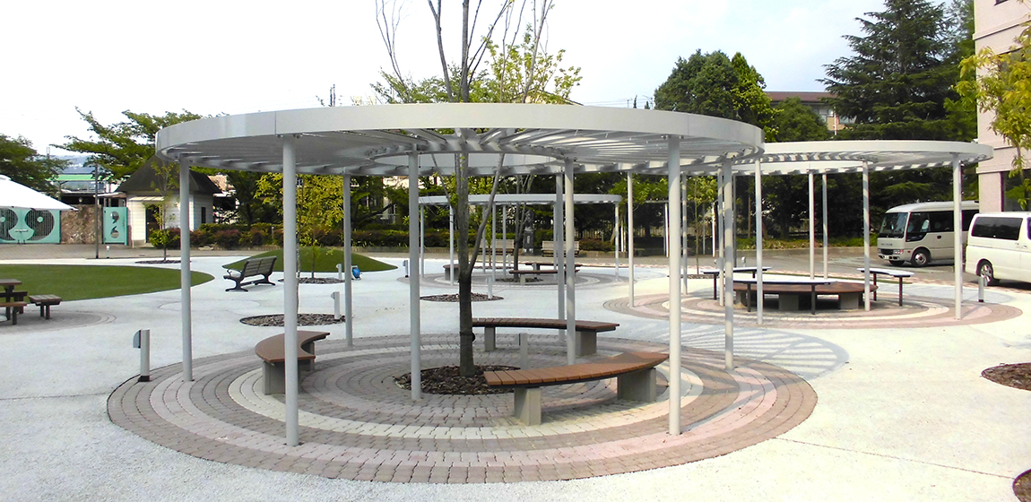 緑豊かな環境に広がる玉手山学園のキャンパス。学生が集い、交流や憩いの時間を過ごせる屋外空間が整えられています。ナカムラは、特産品をモチーフにしたパーゴラをはじめ、特注品の縁台やテーブル、ユニットベンチ、さらにデッキとベンチにライティング機能を組み合わせた設備を設置しました。昼は休憩や交流の場として、夜は照明によってやわらかな雰囲気を演出し、キャンパスの魅力を高める空間となっています。