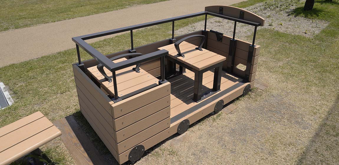 住宅地の中に位置し、地域の人々に親しまれている久里浜1丁目第2公園。日常の遊びや休憩の場として利用されている身近な公園です。ナカムラは、特注シェルターやベンチ、クッションマット、特注単体遊具に加え、電車の形をした特注ベンチを設置しました。地域の特性を感じられるデザインを取り入れながら、遊びと休憩の場を整え、親しみやすい公園空間となっています。