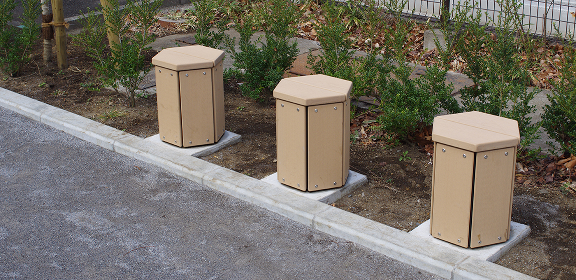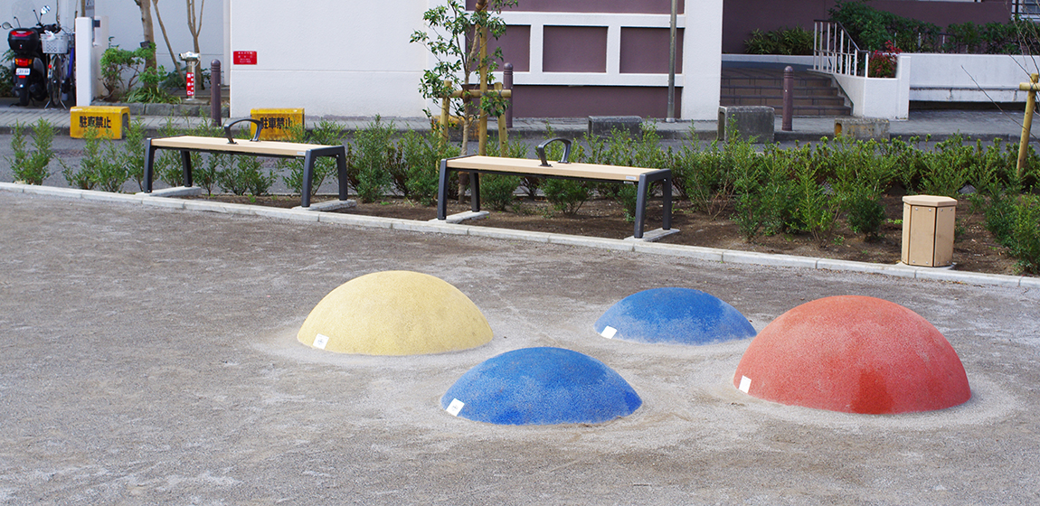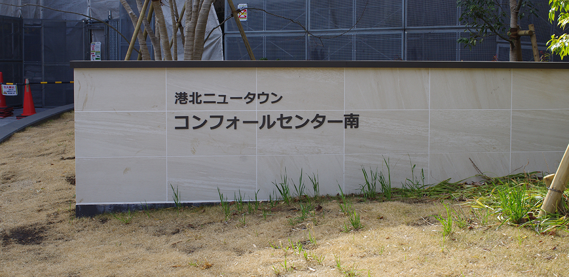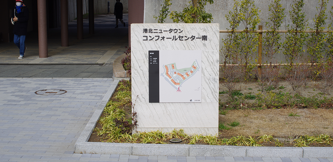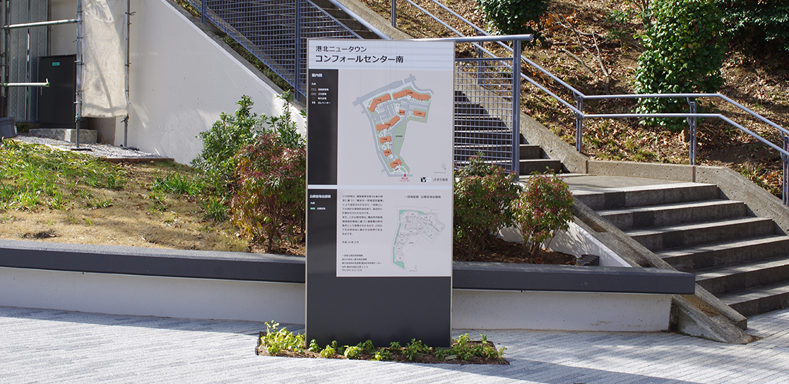 計画的に整備された街並みが広がる港北ニュータウンに位置するコンフォール南。ゆとりある共用空間や歩行環境が整い、住民の日常を支える住環境を形成。サインやベンチ、特注スツールに加え、乳幼児が遊べるインクルーシブな遊具のハーフボール、住民はもちろん、来訪者が敷地内で迷わないために共同住宅で大切な役割を果たすサイン。休憩スペースやインクルーシブな遊びを組み合わせ、憩いの場を演出しています。