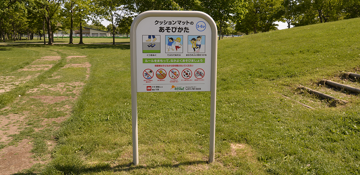 広大な敷地の中で自然や農業に触れられる体験型施設「さとらんど」。家族連れを中心に、多くの来園者が屋外でのびのびと過ごせる空間となっています。ナカムラは、園内の案内サインと特注クッションマットを設置しました。分かりやすい導線づくりと安全性に配慮した設備により、来園者が安心して活動できる環境となっています。