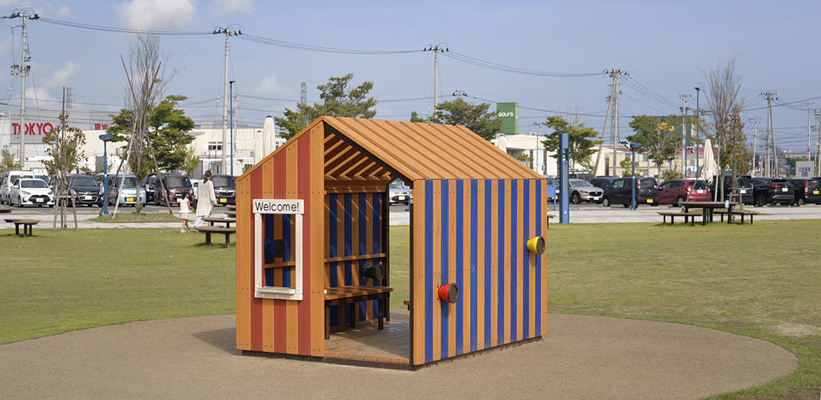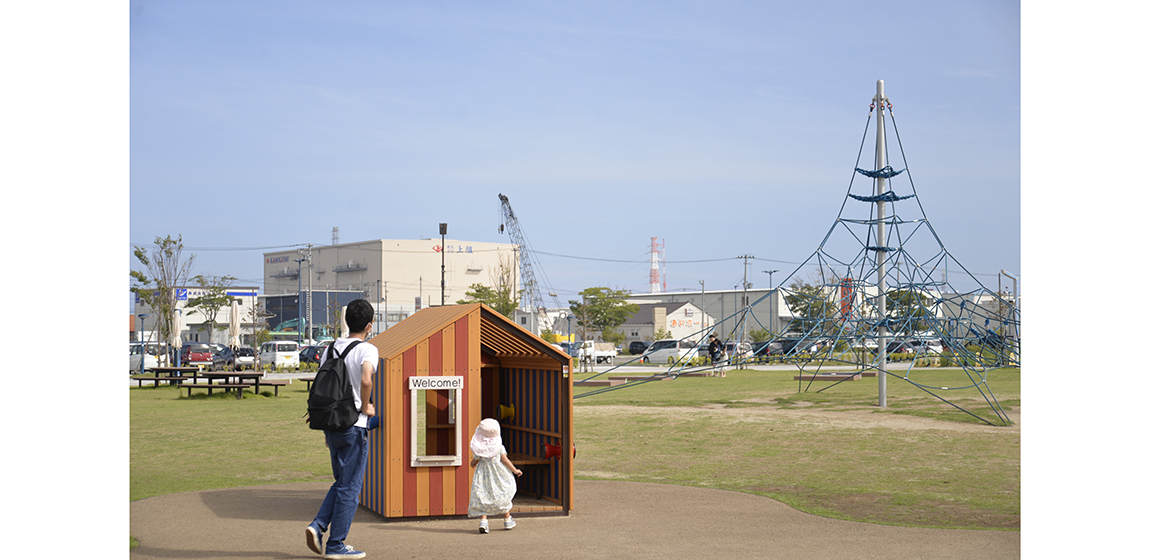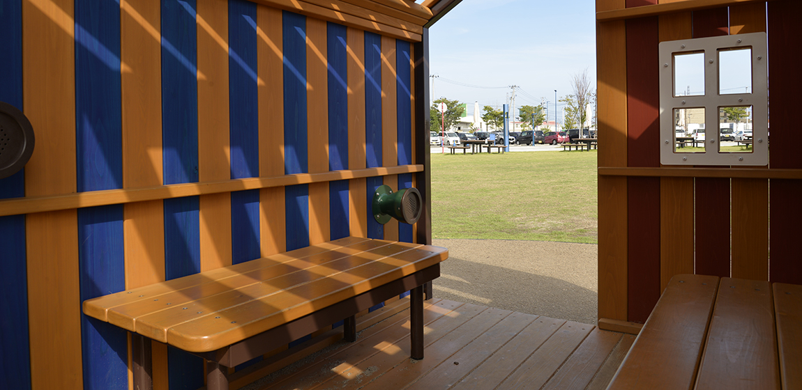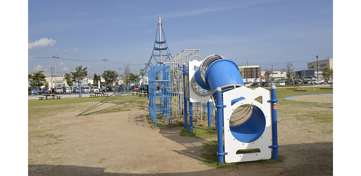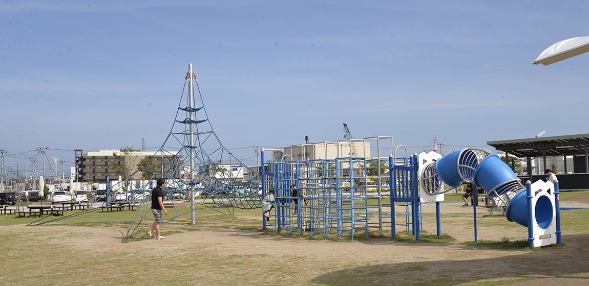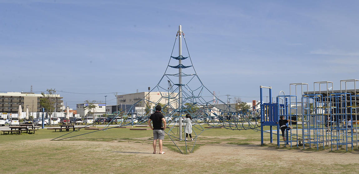 運動施設や水族館が隣接し多くの人から親しまれている高砂中央公園。日常の遊びや憩いの場として、多くの利用者に活用されています。同じクライミング系のタワーネット、ジャングルジムは全身を使って遊ぶことができ、難易度が異なるのでたくさんの子どもに対応。クールダウンもできるごっこ遊びの小屋も配し、多様な子どもに対応する遊び場を創造しています。