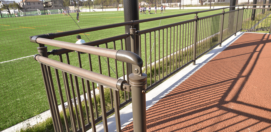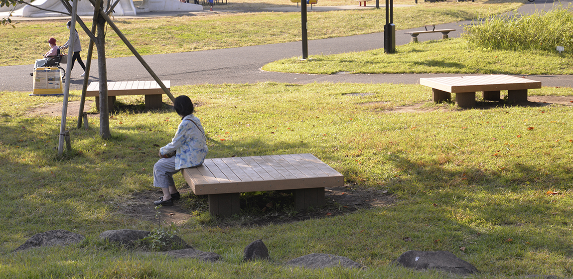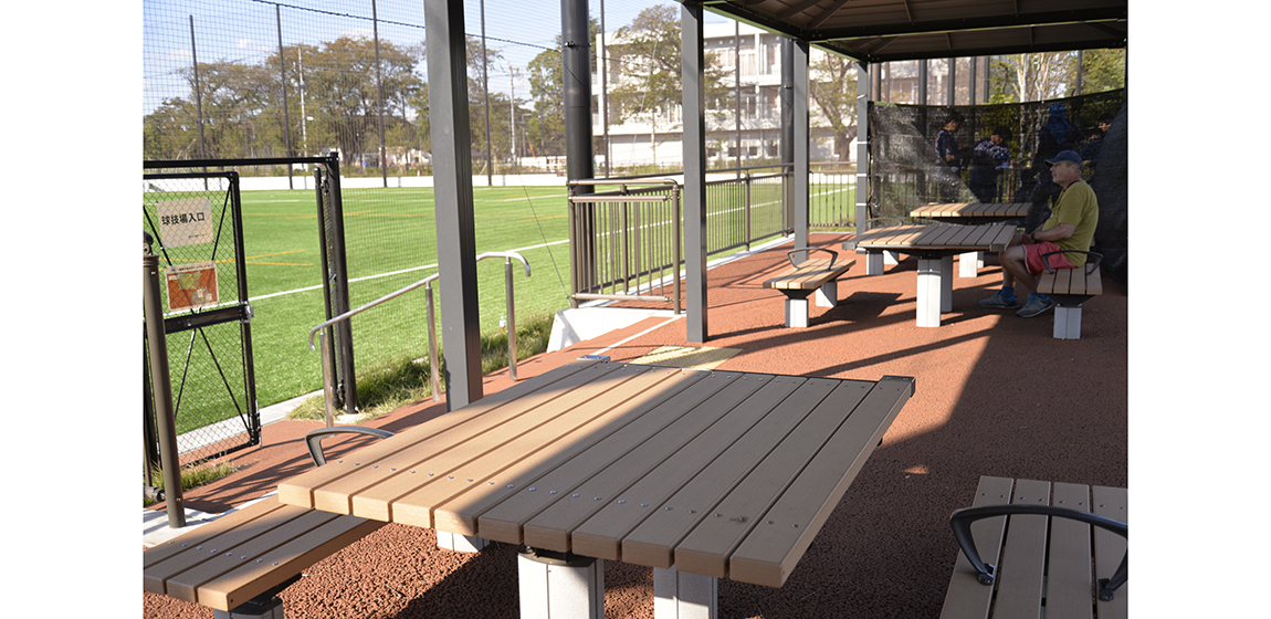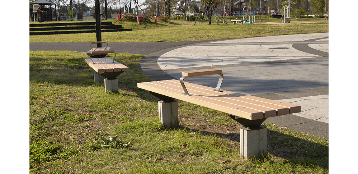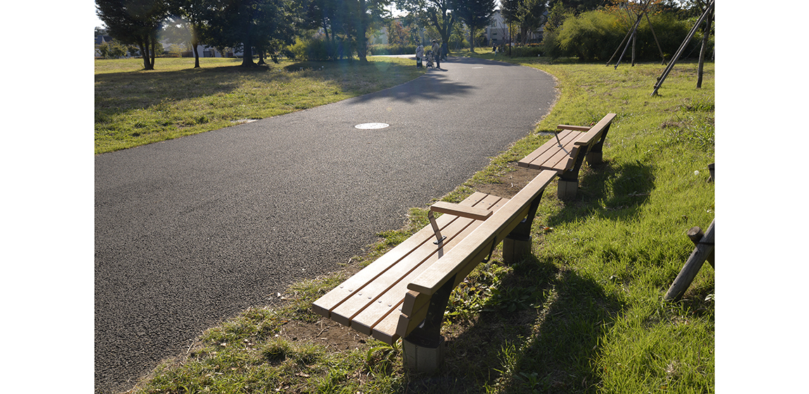 広々とした空間と豊かな緑が広がる都立高井戸公園。遊び場や休憩施設、スポーツ施設などがあり、多くの人が思い思いに過ごせる公園です。ナカムラは、野外卓や縁台、転落防止柵を設置。ベンチはシンプルなデザインのものが採用になり、点在。訪れる人のひと休みスペースとして利用されています。