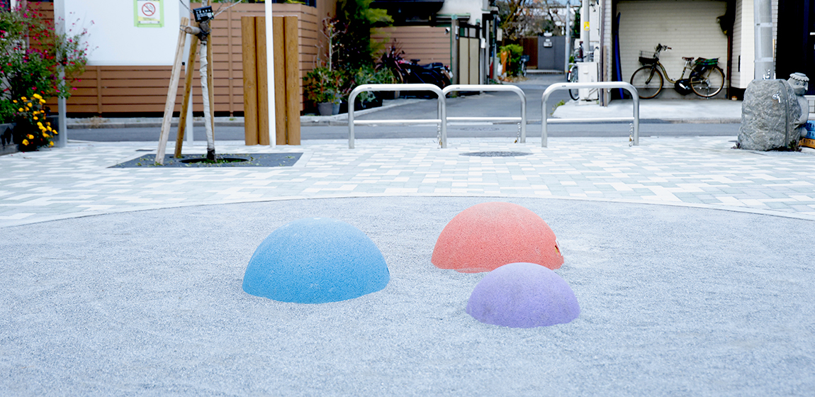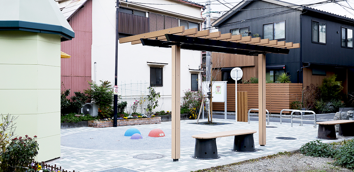 住宅密集地のポケットパークに対応するコンパクトなパーゴラや災害対応のかまどベンチ、乳幼児が遊べるシンプルなゴム製遊具を設置。散策中のひと休みや、だれでも遊べる遊具で地域コミュニティの場として利用されています。