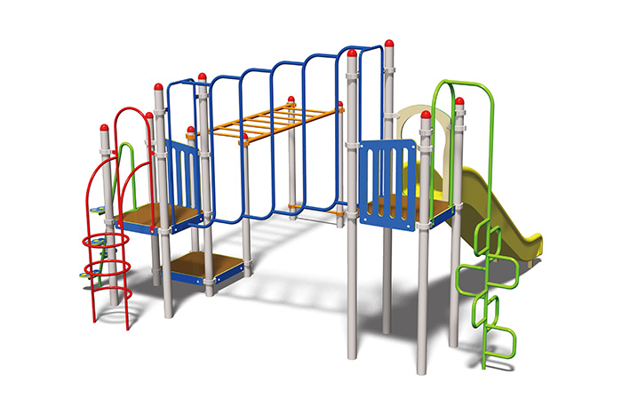 階段を無くしてアスレチック的な遊びをコンパクトにまとめたモデル。デッキに登る遊びは異なる3タイプを配置しています。