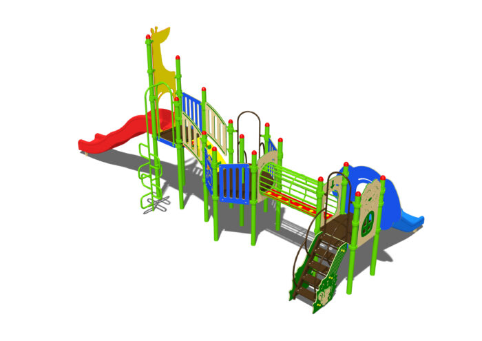 階段を上がると広いデッキがあり、そこから遊びが左右に伸びるレイアウト。幼児の年少、年長それぞれが遊びやすく公園はもちろん、幼稚園にもおすすめのモデルです。