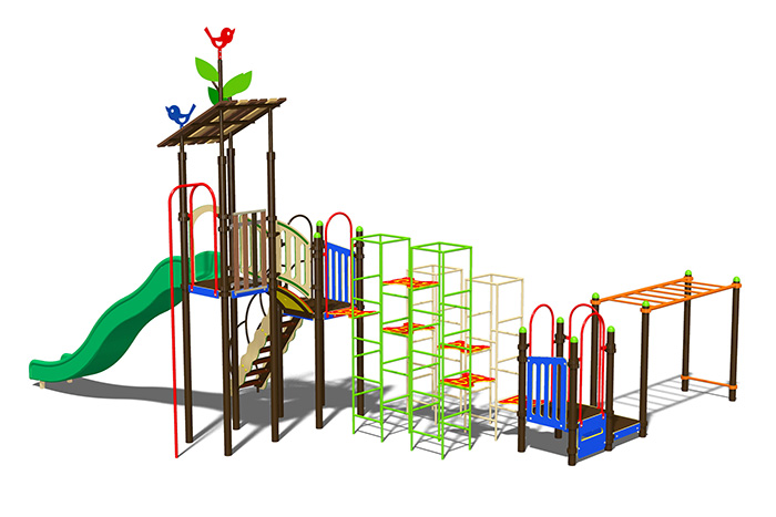 高さ2000㎜のスライダーがシンボル。コミュニケーションの場にもなるスクエアクライマーと体育的な遊びの雲梯をセットしたシンプルモデルです。
