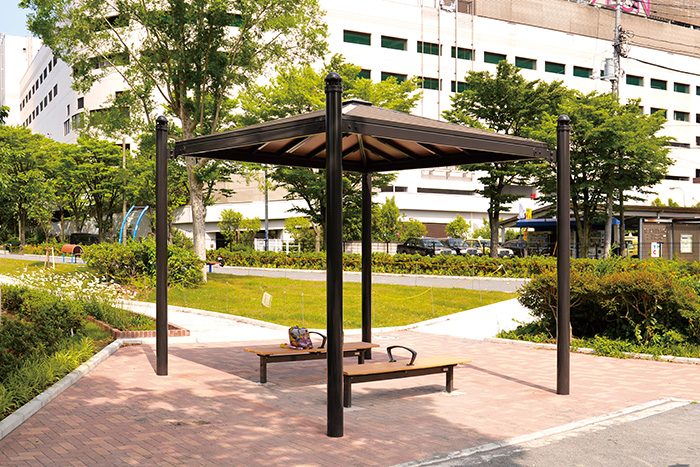 ベーシックなパーゴラや趣のある四阿、ユニットタイプのシェルターなど、憩いのスペースを創造する シェルター系製品。